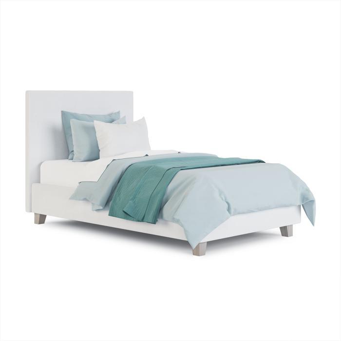 A twin size bed with fabric upholstery in a modern style is a sleek and stylish piece of furniture that can add a touch of sophistication to any bedroom. The bed typically features a simple and minimalistic design, with clean lines and geometric shapes that are characteristic of modern style. The frame of the bed is made from wood, with a low profile that creates a sleek and contemporary look. The fabric upholstery covers the headboard, footboard, and side rails of the bed, providing a soft and comfortable surface to lean against or rest on. The size of the bed is twin, which makes it an ideal choice for smaller bedrooms or guest rooms. It can be paired with a range of bedding and accessories to create a cohesive and stylish look that reflects your personal style. Overall, a twin size bed with fabric upholstery in a modern style is a sleek and sophisticated piece of furniture that can elevate the look and feel of any bedroom. Its simple yet stylish design, combined with its comfortable and soft upholstery, make it a perfect place to rest and relax in style.