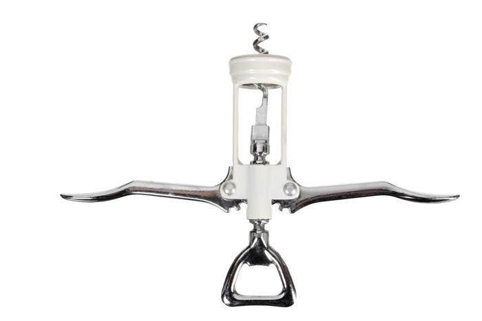 A wine bottle opener is a device used to remove the cork from a wine bottle. This opener features a pointed helix screw that is twisted into the cork, and a handle or lever that is used to pull the cork out of the bottle. Additional features include a bottle opener. This wine bottle opener is lever-style.